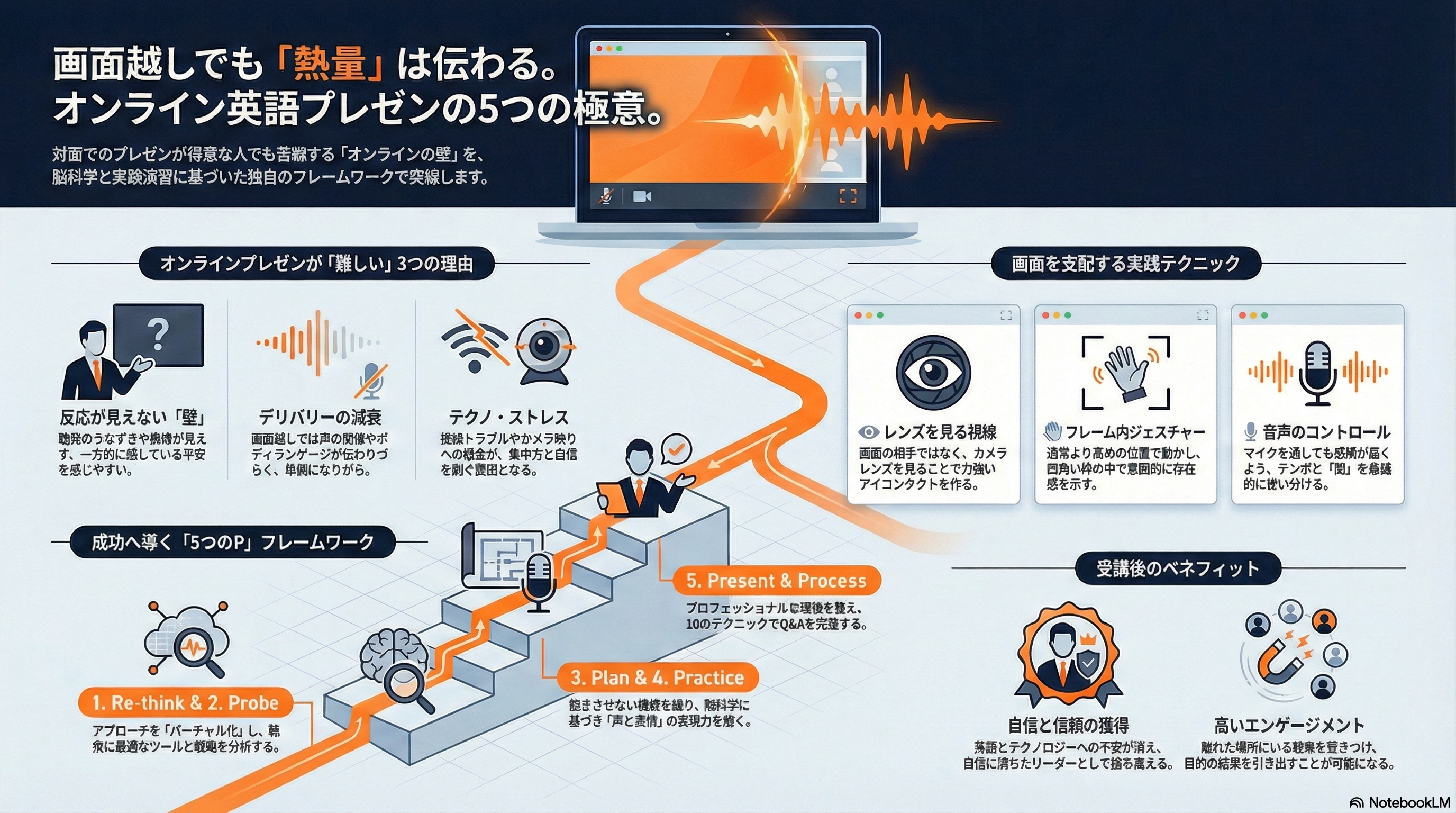 - 「5P」モデルによる体系的学習: 聴衆分析(Probe)から計画(Plan)、練習(Practice)まで、成功するオンラインプレゼンの型をステップバイステップで習得可能